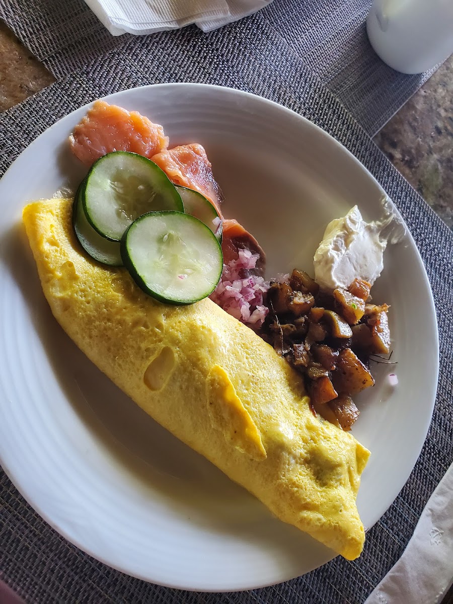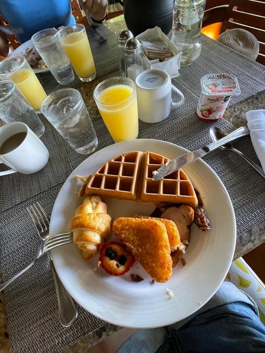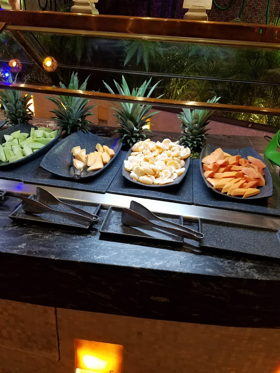Extensive buffet with lots of fresh and delicious fruits, fish and meats, made to order omelettes and waffles. Staff here was exceptional -- wonderful every time. View is delightful, fun to look for the iguanas sunning in the trees :)